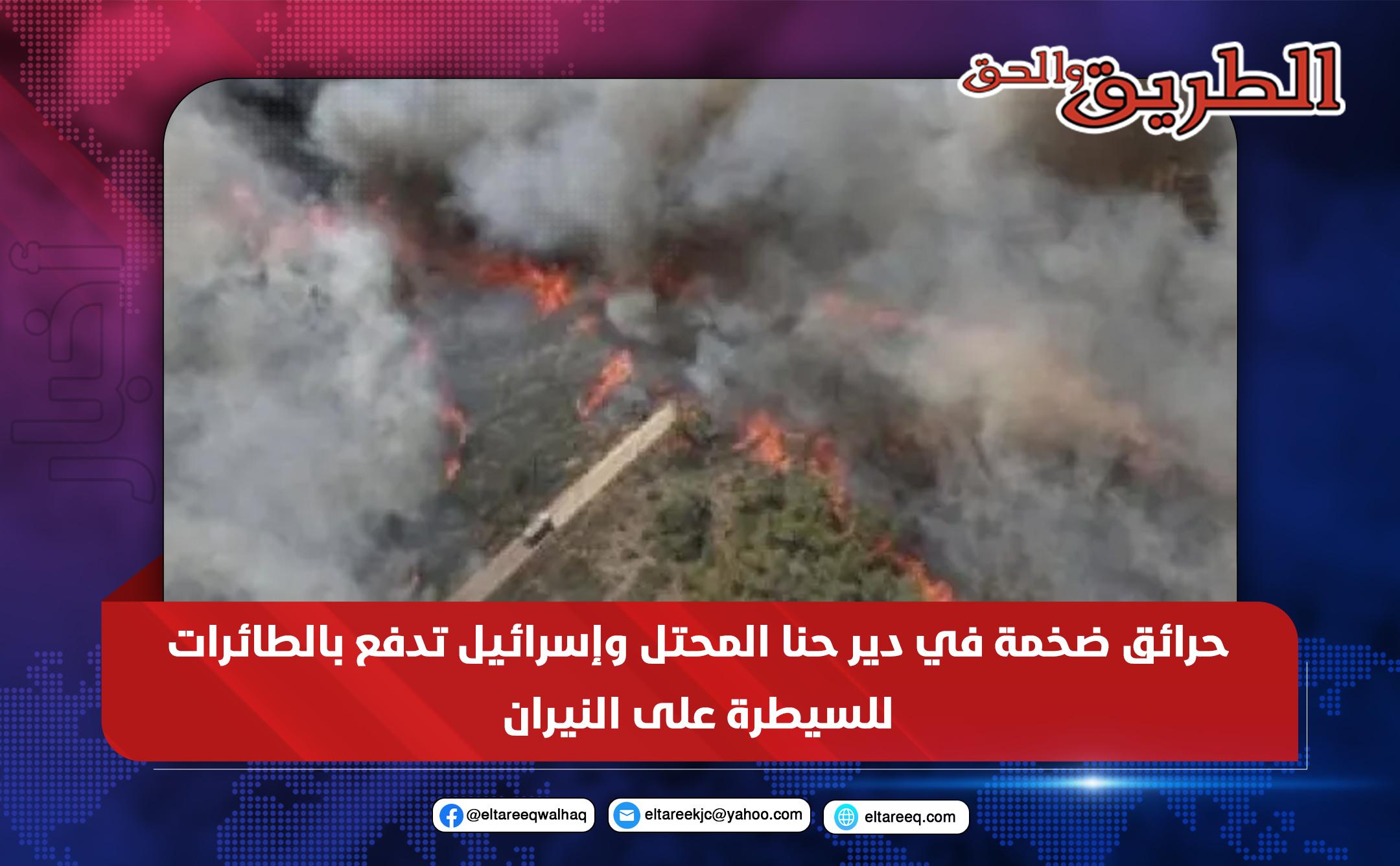 اندلعت حرائق ضخمة في غابات دير حنا المحتلة، مما دفع السلطات الإسرائيلية، بالدفع بـ6 طواقم إطفاء وأربع طائرات للسيطرة على النيران.