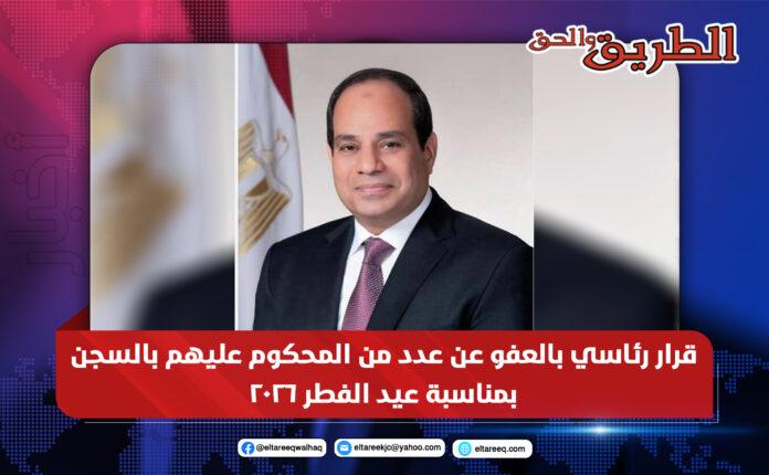 أصدر الرئيس عبد الفتاح السيسي قرارًا بالعفو عن باقي العقوبة لبعض المحكوم عليهم بعقوبات سالبة للحرية، وذلك بمناسبة الاحتفال بعيد الفطر المبارك الموافق الأول من شوال 1447هـ، وعيد تحرير سيناء في 25 أبريل 2026.